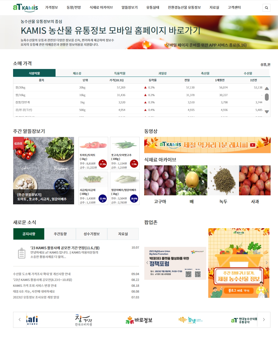 추천된 사이트를 이용하는 방법(https://www.kamis.or.kr)