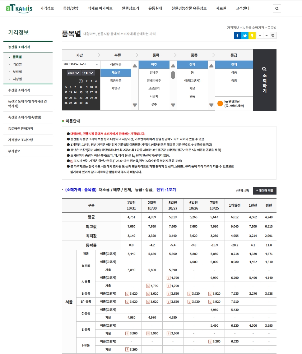 이 추천된 사이트를 이용하는 방법은 간단합니다. 먼저, 해당 사이트에 접속하여 김장철 채소의 품목별 실시간 가격 정보를 조회합니다. 다음으로, 원하는 채소의 가격을 비교하고, 품목, 품종, 등급별 가격 참고하여 채소를 선택합니다. 실시간 소매가격은 대형마트, 전통시장 등에서 소비자에게 판매하는 가격이니 참고 바랍니다.